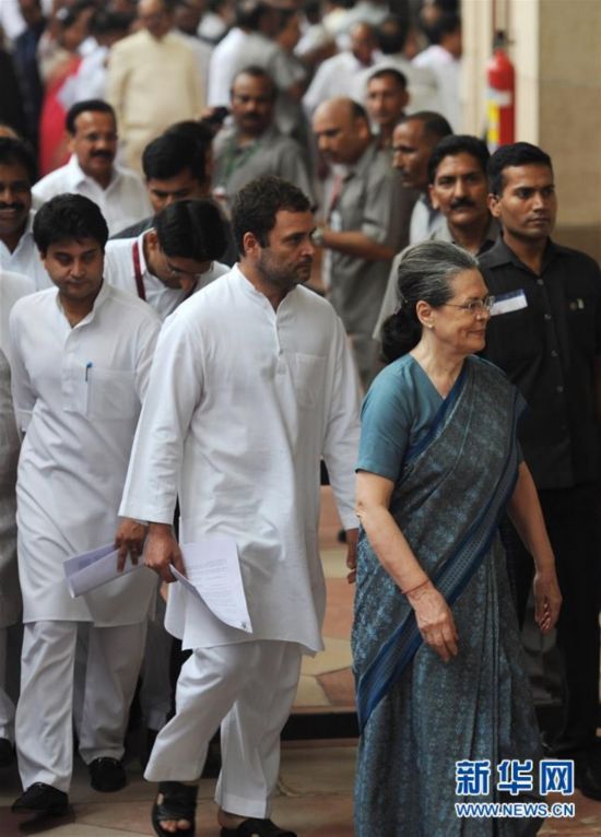 7月17日,在印度首都新德里,印度国大党主席索尼娅·甘地(前右)和副主席拉胡尔·甘地(中)在议会完成投票后走出会场。 2017年印度总统选举17日正式开始投票,由印度联邦议会议员和各邦议会成员组成的选举团将选出新任印度总统,结果将于7月20日公布。