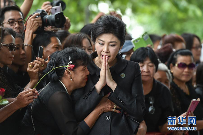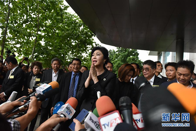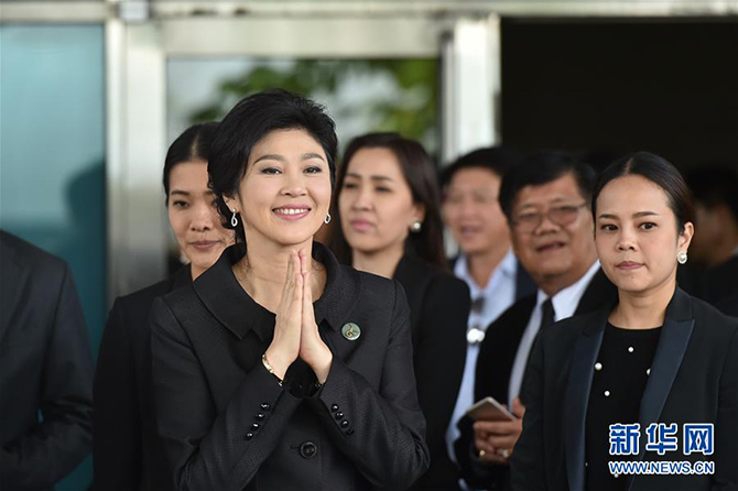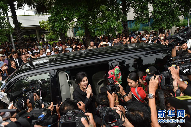 7月21日,在泰国曼谷,泰国前总理英拉(中)在泰国最高法院外向媒体致意。泰国最高法院21日召开前总理英拉所涉大米收购案的最后一场听证庭审,英拉当天到场出庭。最高法院决定于8月25日对此案进行宣判。大米收购项目是英拉2011年8月上台之初开始实施的一项政策,自2014年起,这一以高于市场价格向农民收购大米的政策被批评导致国家财政亏空并滋生大量腐败。新华社记者 李芒茫 摄