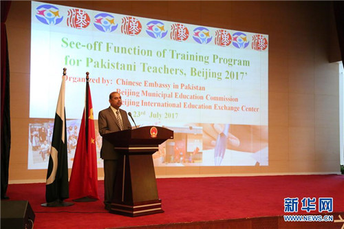 7月23日,在巴基斯坦首都伊斯兰堡,巴基斯坦高等教育委员会执行主任艾尔沙德·阿里在巴基斯坦教师赴华培训送行活动上致辞。艾哈迈德·卡迈勒 摄