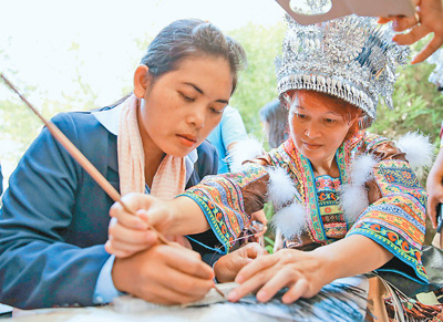 近年来,中国与东盟各国就减贫加强交流与合作。图为来自东盟国家相关行业的技术领军妇女代表参观学习苗族传统手工艺。