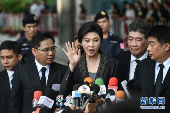 8月1日,在位于曼谷的泰国最高法院前,泰国前总理英拉(中)与媒体交流。泰国前总理英拉8月1日在泰国最高法院作大米收购案结案陈词,称自己为“政治游戏的受害者”,否认检方提出的所有指控。最高法院则再次驳回英拉方面将本案提交宪法法院裁决的诉求,维持将于8月25日对本案进行宣判的决定。新华社记者 李芒茫 摄