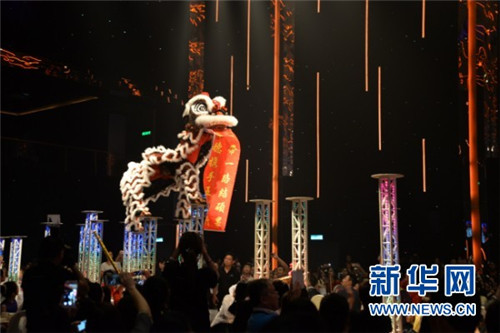 艺术节上,马来西亚青年演员表演“高桩舞狮”。新华网记者 王大玮 摄