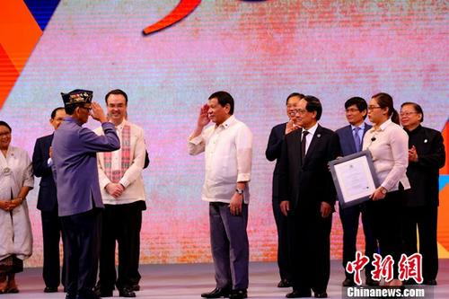 东南亚国家联盟(下称东盟)成立50周年庆典8月8日在菲律宾首都马尼拉举行。东盟轮值主席国菲律宾总统杜特尔特在庆典上向对东盟有贡献的人士颁奖。图为杜特尔特向菲律宾前总统拉莫斯颁发奖状。中新社记者 鈡欣 摄