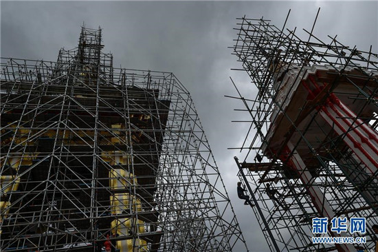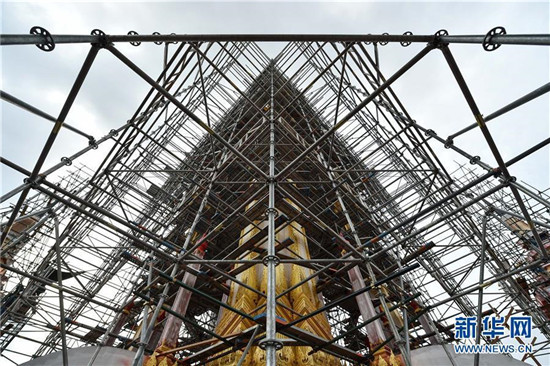 8月8日,在泰国曼谷,工人们在普密蓬国王遗体火化台建设工地的脚手架上施工。新华社记者 李芒茫 摄