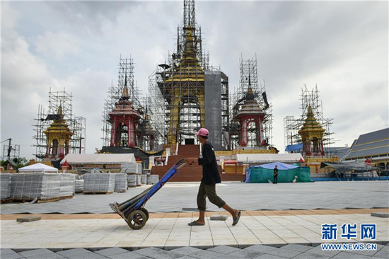 8月8日,在泰国曼谷,一名工人走过修建中的普密蓬国王遗体火化台。新华社记者 李芒茫 摄
