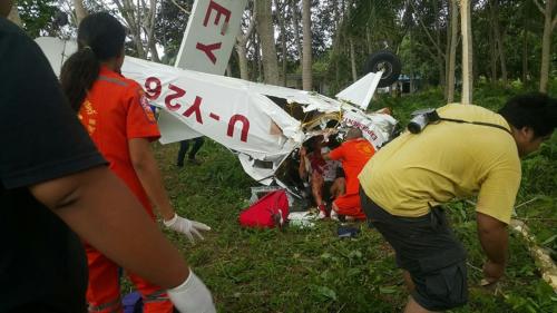 警察赶到现场时发现一架2座位的小型飞机坠落在橡胶园内,飞机的前舱贴在地面上,机上共有2人,分别是技师沙炎和教练叻攀,两人身受重伤,已被送往甲铃医院进行急救。