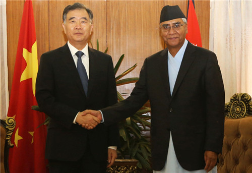 8月16日,尼泊尔总理德乌帕(右)在加德满都会见到访的中国国务院副总理汪洋。新华社发 苏尼尔·夏尔马 摄