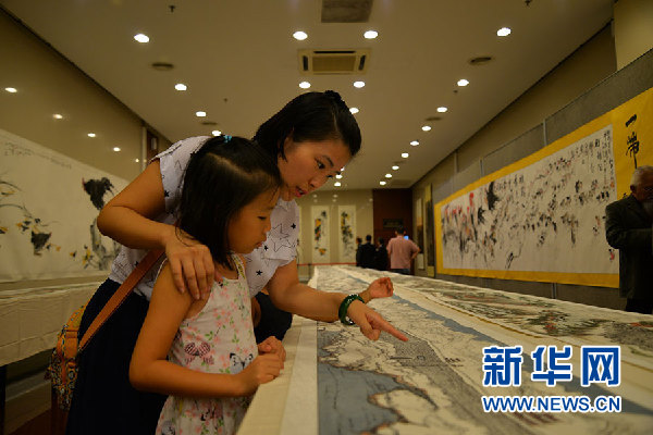 马来西亚华裔小朋友在妈妈的陪同下欣赏水墨作品