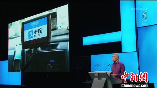新加坡总理在演讲中介绍新加坡出租车接入支付宝。