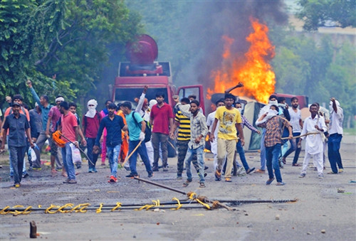 在哈里亚纳邦潘切库拉,骚乱人群向安全人员投掷石块。新华/路透