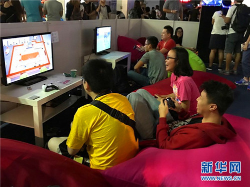 会展现场体验电子游戏的年轻观众。