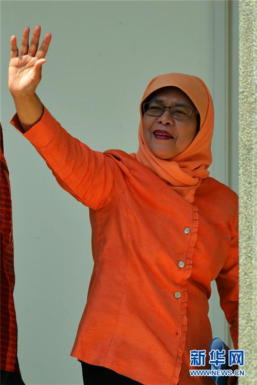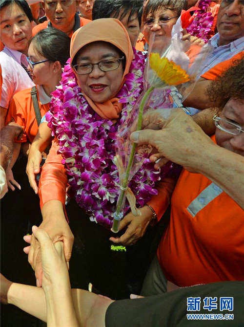 9月13日,新加坡当选总统哈莉玛在总统选举提名中心接受支持者的祝贺。新加坡总选举官13日宣布,新加坡总统选举唯一候选人、前国会议长哈莉玛自动当选该国第八任总统。她也是新加坡首位女总统。新华社记者 邓智炜 摄