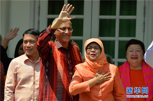 9月13日,新加坡当选总统哈莉玛(右二)及其丈夫(左二)在总统选举提名中心向支持者致意。新华社记者 邓智炜 摄