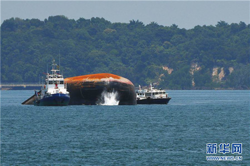 9月14日在新加坡海域拍摄的发生倾覆的挖沙船(中)。新华社记者 邓智炜 摄
