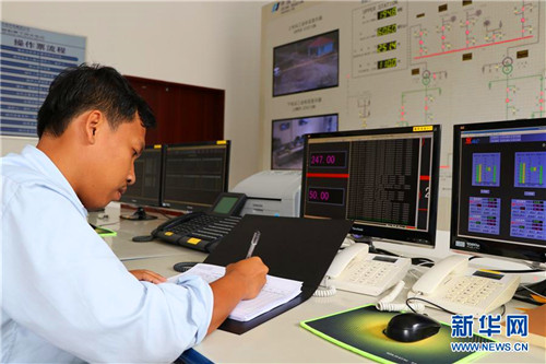8月16日,在柬埔寨戈公省,当地员工肯马戈拉在中国华电集团公司投资建设的额勒赛下游水电站的集控室内登记数据。新华社记者 毛鹏飞 摄