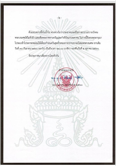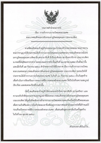 普密蓬的火化仪式将于10月25日至29日举行,其中26日进行遗体火化。