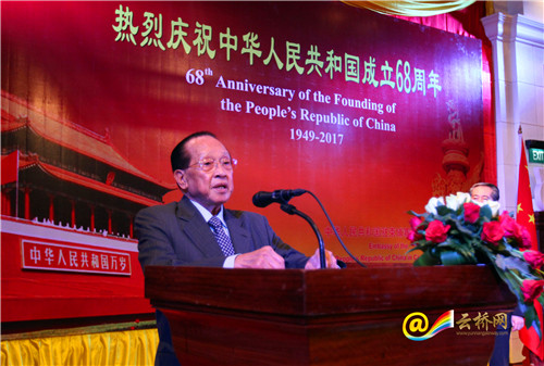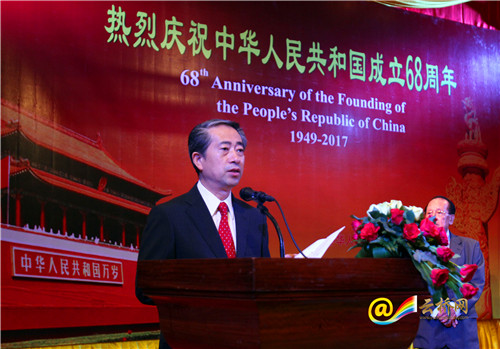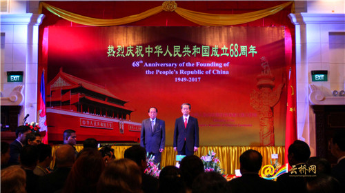 9月28日,中国驻柬埔寨王国大使馆在柬埔寨首都金边举办了庆祝中华人民共和国成立68周年国庆招待会。柬埔寨王室、政府、参议院、国会、军队、各国驻柬外交使团和华侨华人等各界嘉宾,以及中国在柬企业、中资机构代表、留学生、新闻媒体等各界代表欢聚一堂,畅叙友谊。
