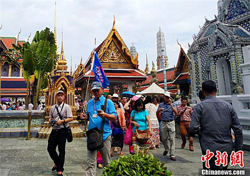 资料图:大量来自中国各地的游客在泰国大皇宫内游览,感受泰国佛教文化。中新社记者 陈燕 摄