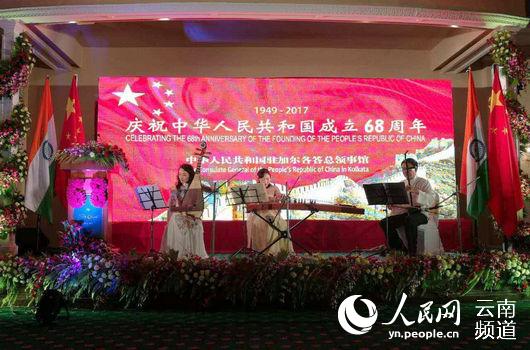 国庆前夕,中国驻印度加尔各答总领事馆举行国庆招待会。当地相关领导以及大中院校长、商界精英和各界友好人士、各国驻当地总领事和代表、华侨华人、中资机构代表,总领事全体人员约500人出席招待会。应邀请,云南省中华文化促进会二胡演奏家马云德、青年琵琶演奏家杨利、青年古筝演奏家侯杰一行赴邀并参加演出。