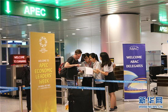 11月3日,在越南岘港国际机场,工作人员为一名参会人员提供服务。 2017年亚太经合组织(APEC)领导人会议周将于11月6日在越南岘港拉开帷幕,其间将举行APEC第二十五次领导人非正式会议。