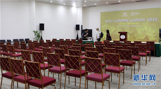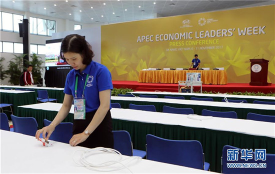 11月4日,在越南岘港APEC国际媒体中心,工作人员进行准备工作。 2017年亚太经合组织(APEC)领导人会议周将于11月6日在越南岘港拉开帷幕,其间将举行APEC第二十五次领导人非正式会议。