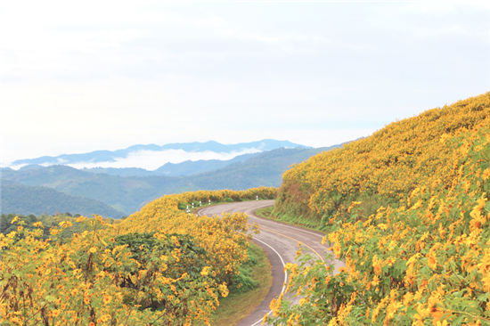 从清迈出发,沿着108号公路走……我觉得很有必要强调一下去湄宏顺的路~路~路啊,前200公里还行,虽然也是有坡度有弯曲,但都不是事,后边的路那才叫山路十八弯啊,据说整个108号公路到达湄宏顺有1864个弯道,哭晕Supanee。幸亏有老司机带路。到达县城之后,再沿着1263号公路走26公里,就可以看见花海了。