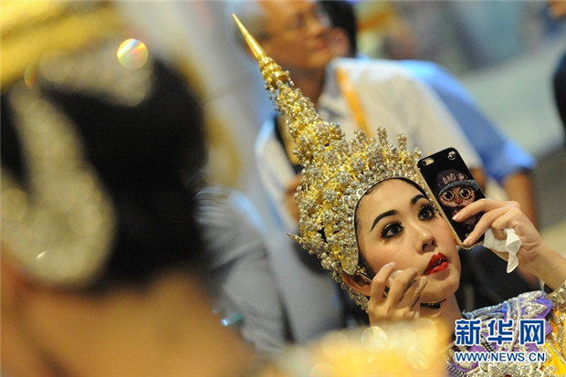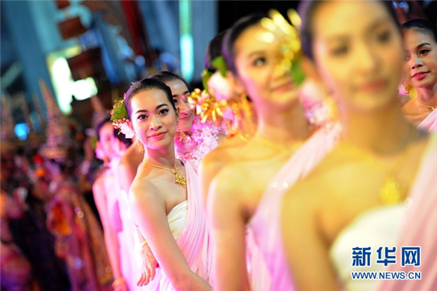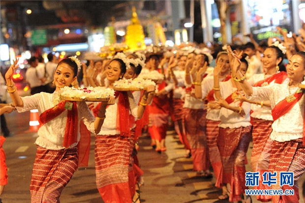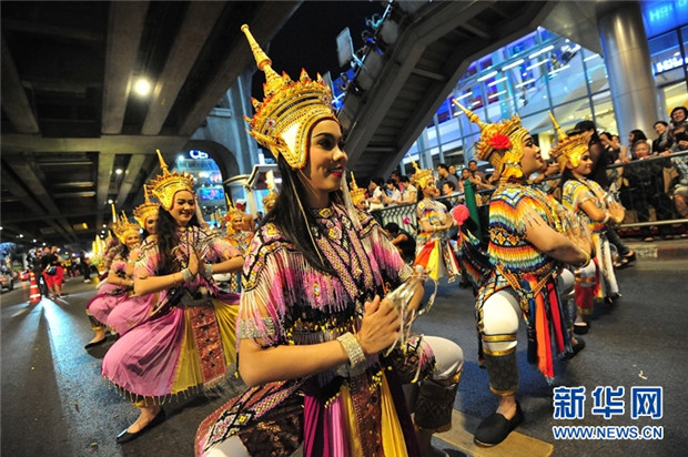 泰国政府11月15日在暹罗广场对开马路举行“2018神奇泰国旅游年”花车游行,图为当晚参加花车游行的表演人员。新华网发 Rachen Sageamsak摄