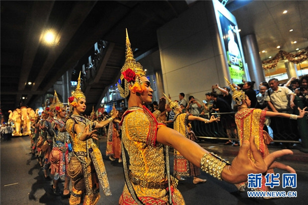 泰国政府11月15日在暹罗广场对开马路举行“2018神奇泰国旅游年”花车游行,图为泰国南部那空是贪玛叻府的穆诺娜剧表演。新华网发 Rachen Sageamsak摄