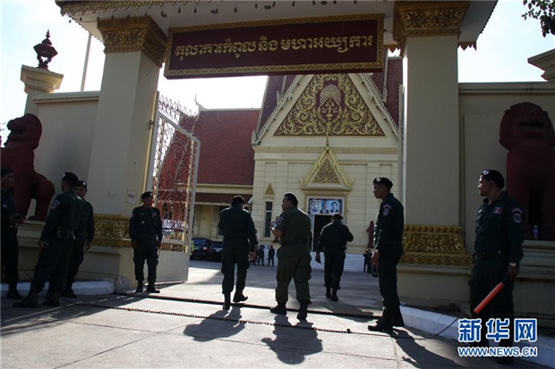 11月16日,在柬埔寨金边,警察在柬埔寨最高法院门前警戒。柬埔寨最高法院16日作出裁决,解散柬反对党救国党,并禁止该党118人五年内参政。柬内政部称,救国党暗中勾结外国势力,妄图通过“颜色革命”推翻柬埔寨合法政府。新华社发(索万纳拉 摄)