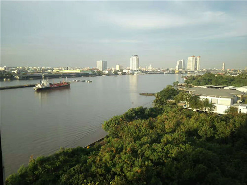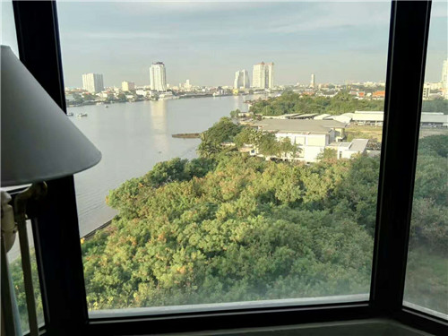拉开窗帘就是湄南河,窗外的湄南河停泊着游轮船只,在蓝天白云衬映下,河水静幽,有的只是近乎于凝固的时间和让人心情无比舒爽的安静。