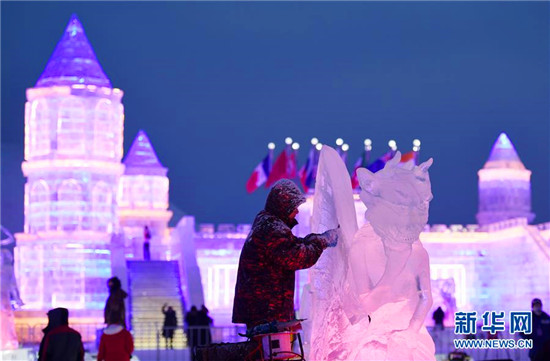 1月7日,冰雕艺术家在灯光映射中创作冰雕作品。当日,在哈尔滨冰雪大世界园区内进行的第32届哈尔滨国际冰雕比赛进入第二天。参赛的各国冰雕艺术家在五彩斑斓的灯光中创作冰雕作品。新华社记者 王建威 摄