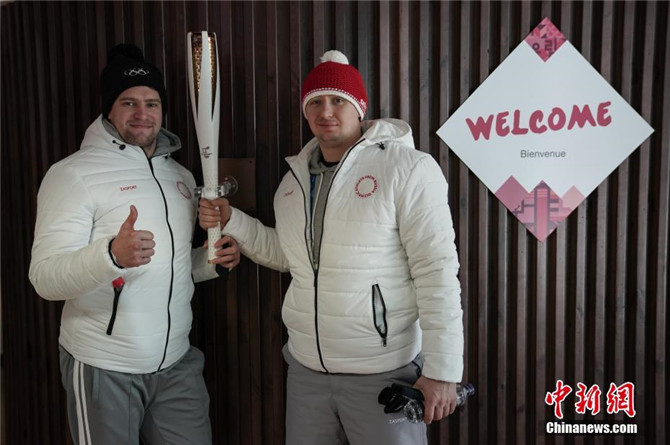 图为俄罗斯奥林匹克选手在平昌奥运村内与本届冬奥会火炬合影。中新社记者 崔楠 摄