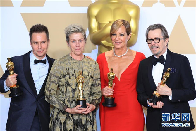 3月4日,在美国洛杉矶杜比剧院,第90届奥斯卡最佳男配角奖获得者山姆·洛克威尔、最佳女主角奖获得者弗朗茜·麦克多曼德、最佳女配角奖获得者阿丽森·詹妮和最佳男主角奖获得者加里·奥尔德曼(从左至右)合影。第90届奥斯卡颁奖典礼4日在洛杉矶好莱坞杜比剧院举行。 新华社记者李颖摄