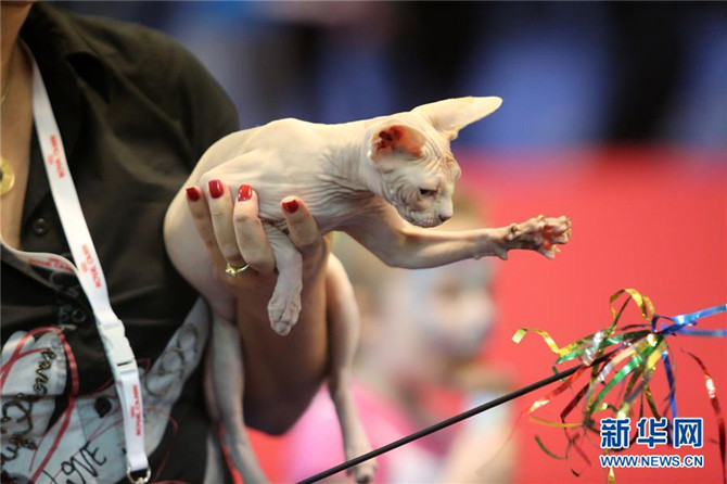 4月14日,在罗马尼亚首都布加勒斯特,一只斯芬克斯猫参加“选美”比赛。当日,为期两天的猫咪“选美”大赛在罗马尼亚展览中心举行,来自世界各地的250余个品种的宠物猫参加比赛。 新华社发(彼得雷斯库摄)