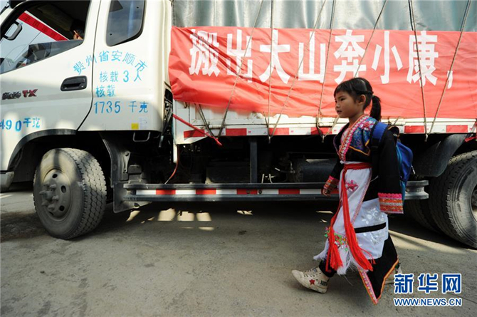 4月22日,吉雪背着书包经过一辆搬迁的货运车。新华社发(杨文斌 摄)