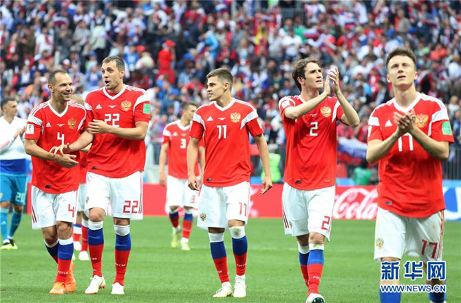 6月14日,俄罗斯队球员在获胜后庆祝。新华社记者 杨磊 摄