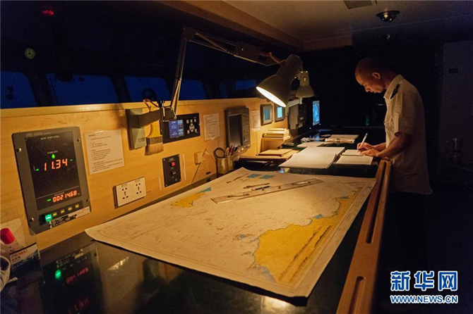 6月20日凌晨,“金海发”轮二副涂开元在驾驶台记录航海日志。