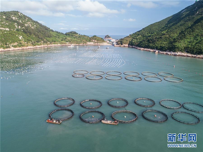 8月18日,渔船在南麂岛马祖岙海域的“海上牧场”大黄鱼养殖区内喂食(无人机拍摄)。