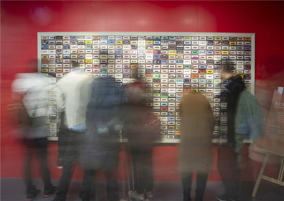 11月18日,观众在展览的“时光博物馆”内观看怀旧磁带墙(慢门拍摄)。“伟大的变革——庆祝改革开放40周年大型展览”11月13日在国家博物馆隆重开幕。自开幕以来,展览吸引了众多参观者。截至11月18日,累计参观人数超过19万人。