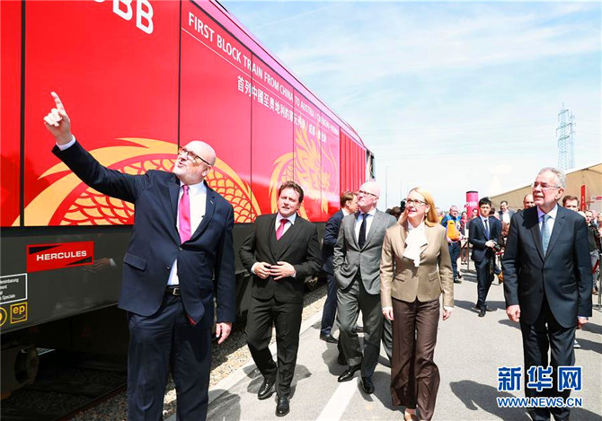 4月27日,在奥地利维也纳货运南站,奥地利国家铁路总公司总裁安德烈斯·马铁(左一)陪同奥地利总统范德贝伦(前右一)、奥地利数字与经济事务部长玛格丽特·施兰伯克(前右二)等嘉宾一同视察刚刚抵达的成都—维也纳中欧班列。当日,首列直达奥地利首都维也纳的中欧班列抵达目的地。奥地利总统范德贝伦表示,中欧班列是奥地利和中国友好合作的象征。首列直达维也纳的中欧班列4月12日从成都发车,穿越亚欧6国,行程9800公里。这趟班列装载的货物包括电子配件、LED灯具和睡袋等。新华社记者潘旭摄