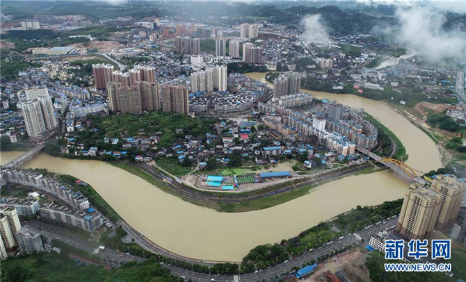 7月6日,贵州省铜仁市松桃苗族自治县松江河水位上涨(无人机拍摄)。