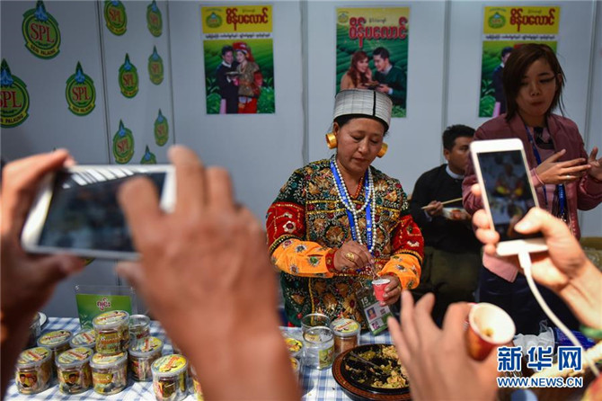 9月12日,在广西南宁国际会展中心东盟博览会展厅,观众在拍摄缅甸美食。新华社记者 李芒茫 摄