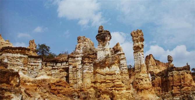 在牟定县城以北10公里处的牟姚公路边,有一个神奇而美丽的地方,远古的时候人们称之为“塔凹”,现在人们称它为“土林”。这是一颗大自然经心镶嵌在家乡红土地上的美丽宝石,明代旅行家徐霞客的记载一点也不夸张:“涉枯涧,乃蹑坡上,其坡突石,皆金沙烨烨,如云母堆叠,而黄映有光,时日渐开,蹑其上,如身在祥云金粟中也”。