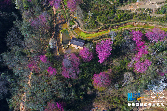 航拍:哈尼山寨樱花盛开 与梯田相映成趣