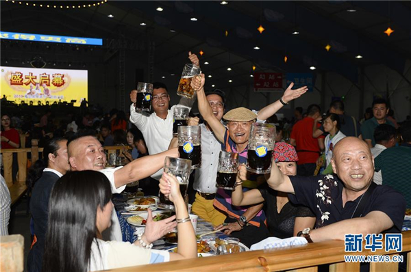 人们在啤酒节上畅饮(8月10日摄)。 8月10日晚,2018第三届慕尼黑啤酒节——昆明之旅在云南昆明启幕,美酒、美食、欢歌引爆欢动时刻。