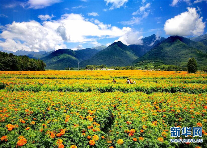 随着秋季来临,云南省保山市腾冲市界头镇种植的两万余亩万寿菊相继开放,高黎贡山下花海美景吸引了大量游客前来观赏,游客的到来也为当地农民带来了新的致富渠道。