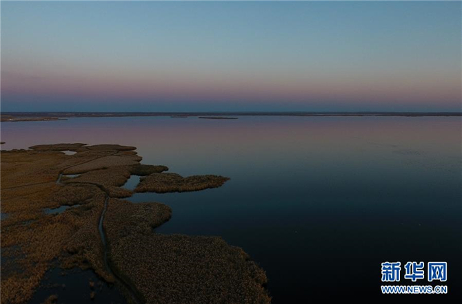傍晚的居延海水天一色(10月12日无人机拍摄)。新华社记者 刘磊 摄