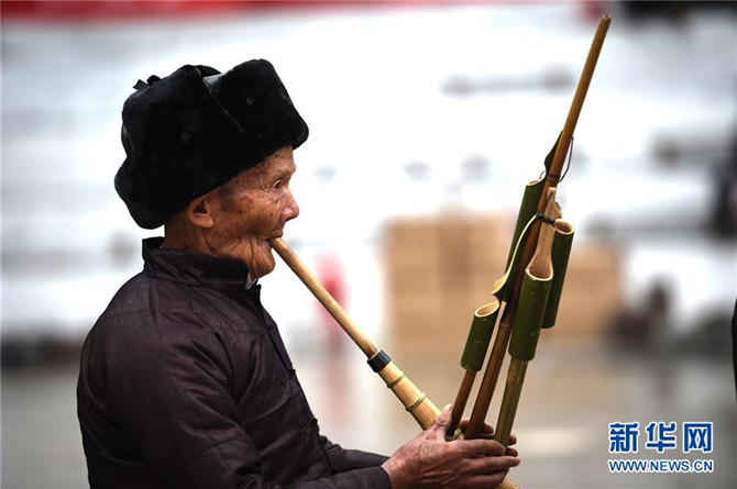 1月18日,在榕江县仁里乡仁吉侗寨,一名老人在吹奏芦笙。新华社记者 戴天放 摄