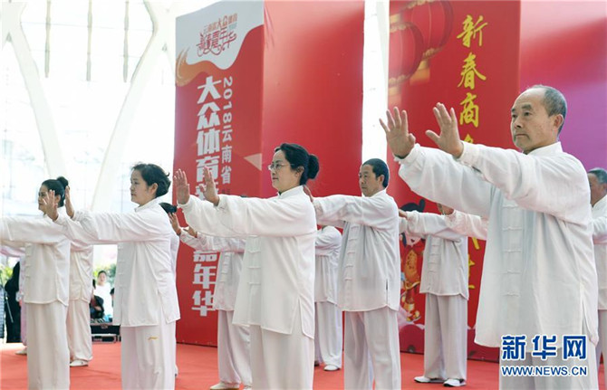 1月27日,群众在进行健身气功表演。当日,主题为“幸福生活、体育迎春、健康一生”的云南省2018年大众体育新春嘉年华在昆明滇池国际会展中心拉开帷幕,活动将持续16天,来自全省各地的群众体育爱好者以丰富多彩的形式,展示全民健身的风采。新华社记者 杨宗友 摄