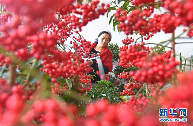 3月12日,山东省沂源县东里镇前河南村的农民在管护花卉。新华社发(赵东山 摄)